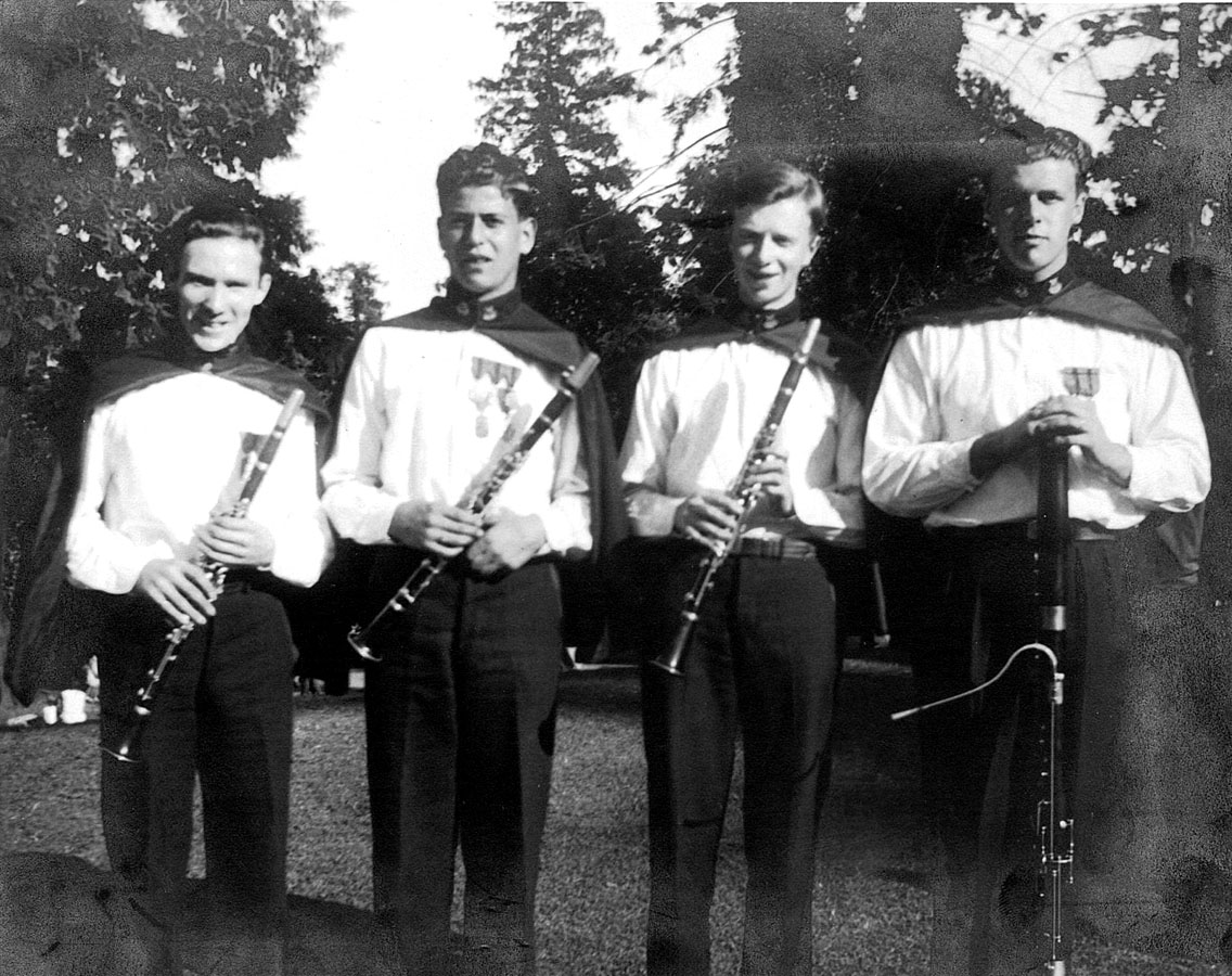 Arthur: I don’t want you to think we ran away with the trophy. He pointed to the silver cup at his feet. There were ten junior bands competing, and in my opinion the first, second, and third were very close. When the marks were given out and we were 24 ½ points ahead, it was only a matter of whoopee.”””Roy Johnston: “Arthur was different from other musicians of the day. He did not drink or use profanity and he prospered. Mickey Hunt was another professional trumpet player around Vancouver in those days. Mickey Hunt played at the Hotel Vancouver. There was a tunnel underneath the hotel that led to the Castle Hotel. When the first show was over, the band would all go over to the Castle and sit there until it was time to go back for the second show. Mickey could drink twenty glasses between shows and still play a good show. I took lessons from Mickey Hunt. My dad would meet Mickey once a month at the hotel and he would pay him for my lessons. By the time my dad left Mickey, all the money he had given him had been spent. He never owned a home. He always lived in a rental place. He ended up on welfare, in a city-owned house near fourth and Alma. He lived there until he went into the hospital where his legs were amputated and he died. There were lots of stories about the escapades of Mickey Hunt! That was the way so many were.”